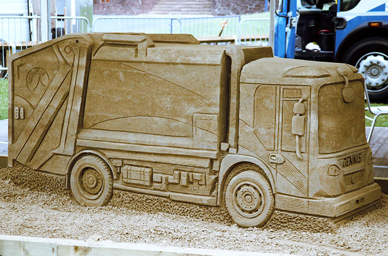 Eight tonnes of fine builders sand was hand shoveled into a forme, mixed with water and compacted by Jamie from Sand In Your Eye and Mick from Areca Design. After hardening overnight into compact block of sand. Jamie then skillfully sculptured the sand into a replica of a short-wheelbase, smooth-body Olympus Elite 2 refuse collection vehicle.